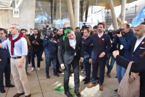 - Responsabilizámos o Ministro do Ambiente por compactuar com as empresas que em Portugal estão a lucrar com as crises climática e de custo de vida. Atirámos ovos com tinta ao Ministro, avisando que não iria poder continuar a condenar o nosso futuro.